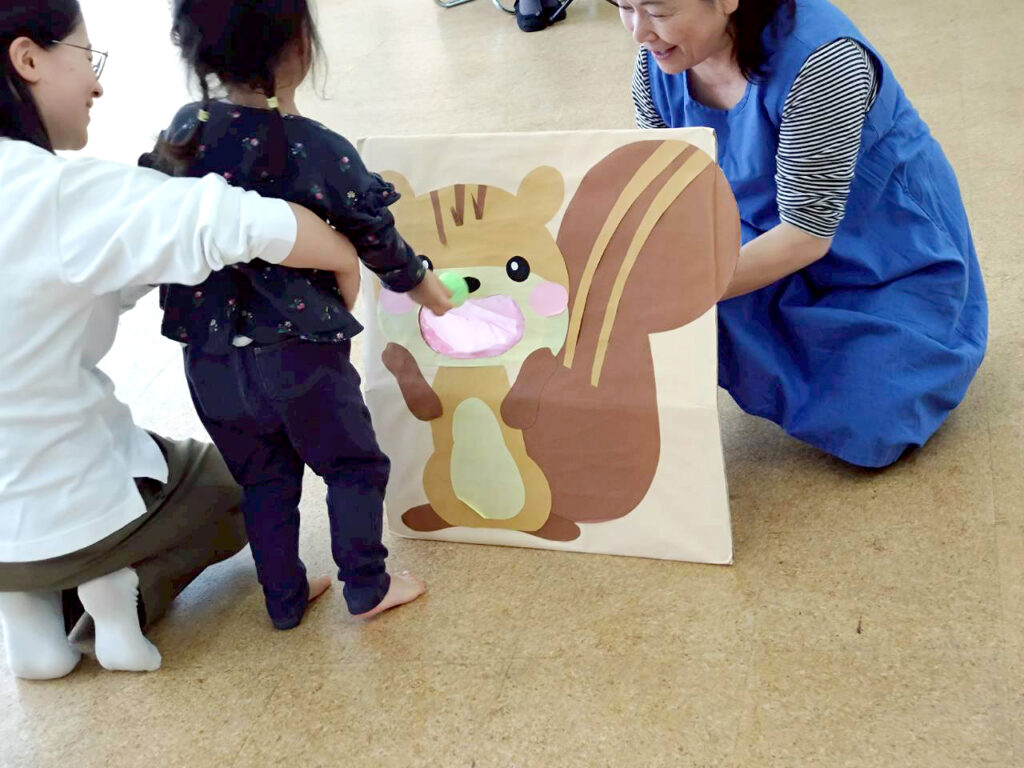 「どんぐりころころ」の歌を歌いながら、リスの口に、どんぐりを入れてあげました。