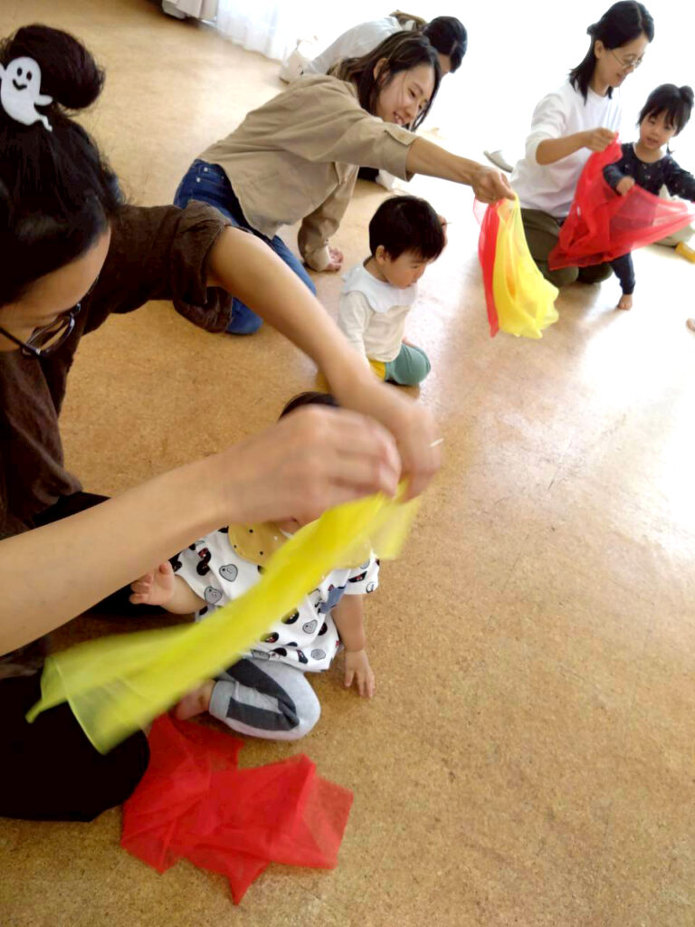 布を葉っぱに見立てて、ひらひらさせたり、大きなバルーンに葉っぱを散らしました。なかなかバルーンから葉っぱの布が落ちずに、四苦八苦しました。