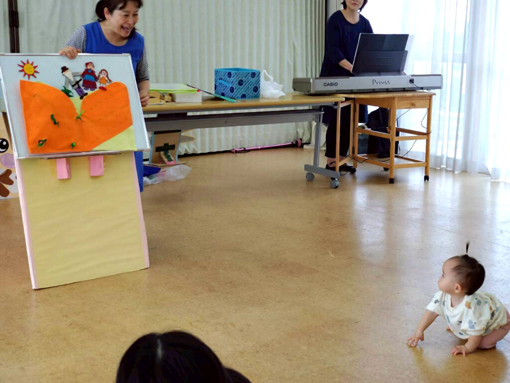最後にパネルシアターで、「大きなカブ」をアレンジした「芋掘り」を楽しみました。