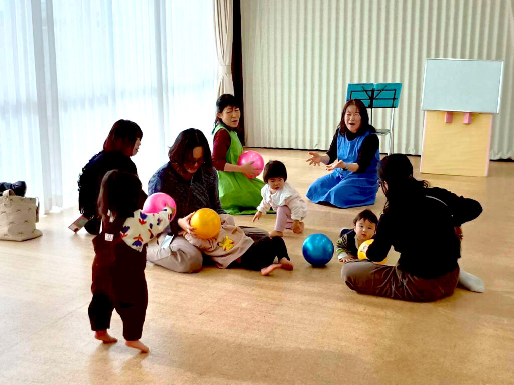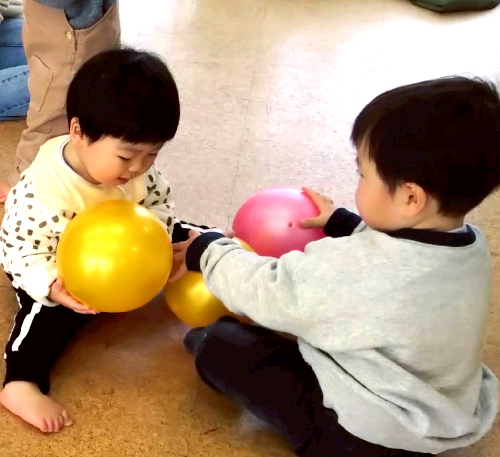 お茶休憩の後はボール遊び。お餅に見立ててぺったんぺったん。いろんなお餅を作りました。曲に合わせてコロコロしてくれたお友達もいました。その後は親子でのボール転がし遊び。距離が遠くなるにつれて思わぬ方向に行ってしまうボールに翻弄されていました。
