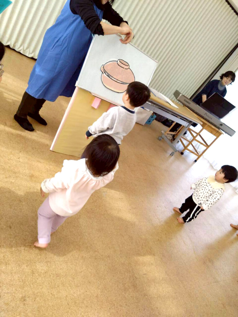 転がされたボールは餅巾着に変身。そのままおでんの具となっておでんのパネルシアターと続きます。次々と出て来るおでんの具が気になりパネルシアターに近づいて行く子どもたち。勢いのある合いの手が入る歌もありとても楽しい雰囲気に包まれました。