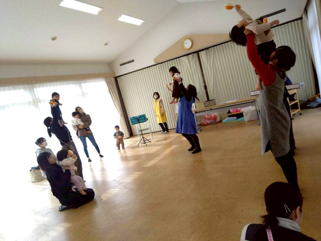そして最後にマラカスが出て来くると『なにこれ、なにこれ』と興味津々。手に握りしめて振ったり眺めたり。『たこたこあがれ』の曲に合わせて振るといつの間にかたこになってママにたかいたかいされていました。ママ達、最後の大仕事お疲れ様でした。