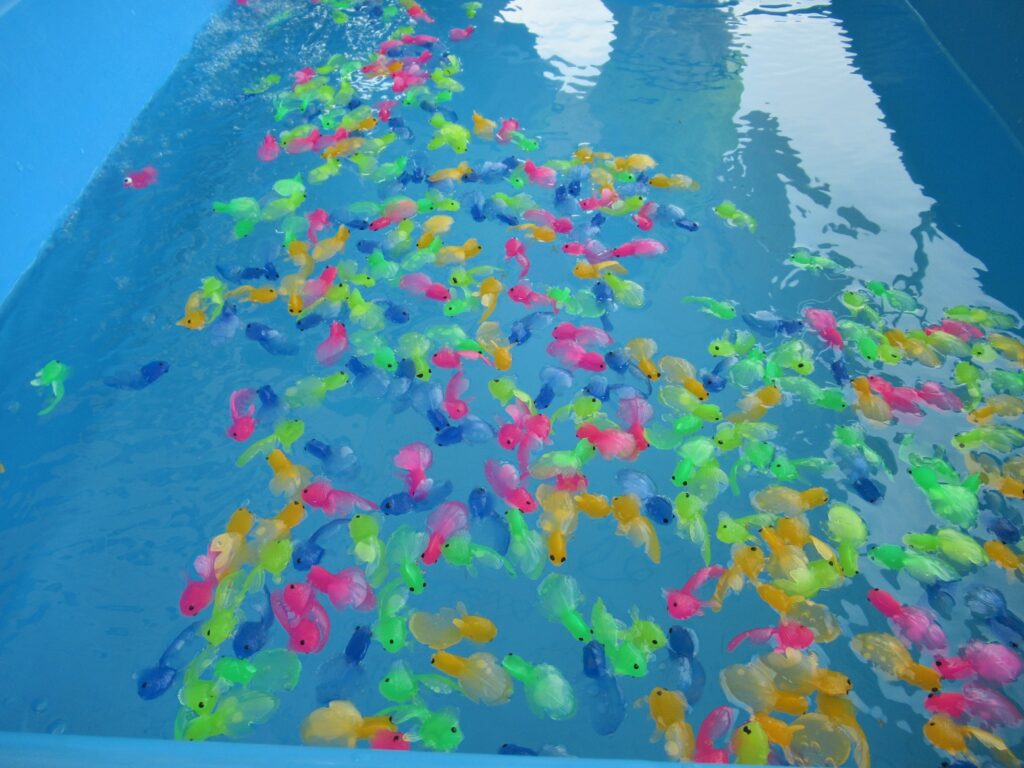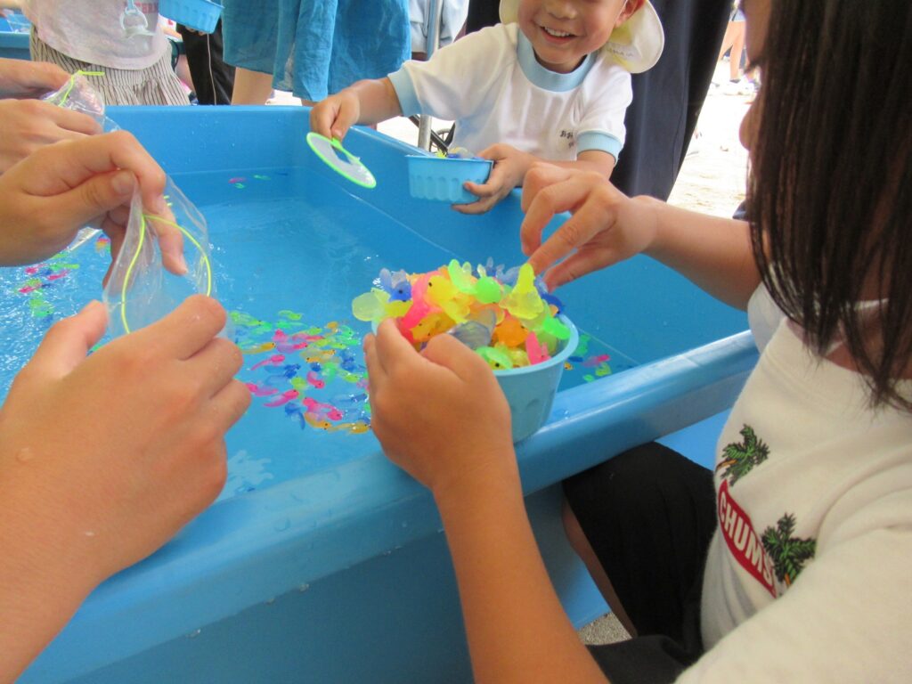 プラスチックの金魚を、生魚の金魚に見立てて、ポイで掬います。生魚より簡単に掬えるので、小さいお子さんは特に楽しめます。