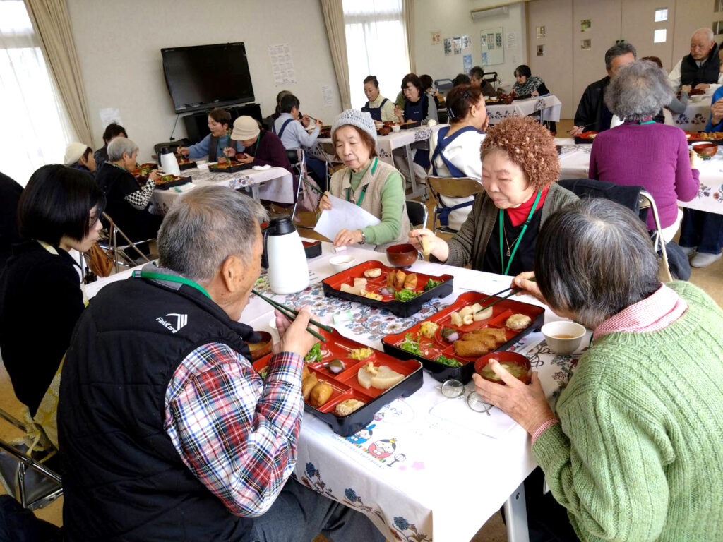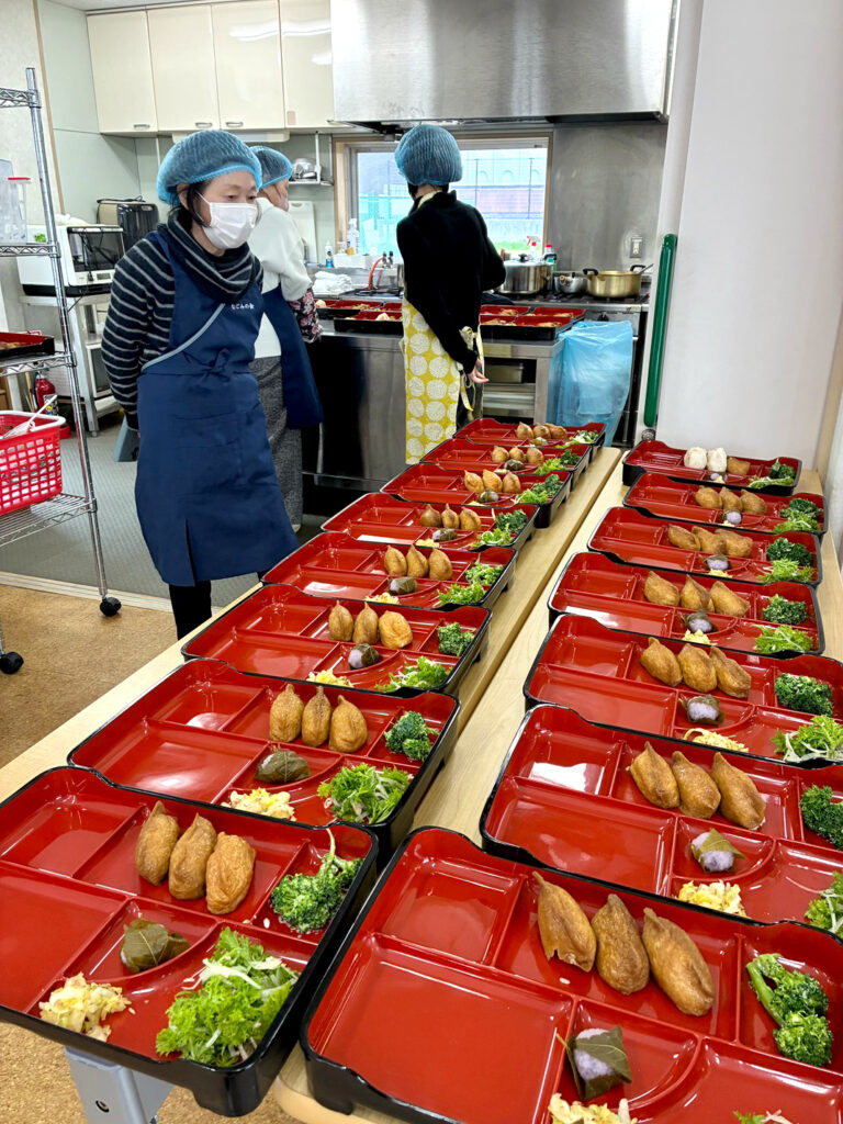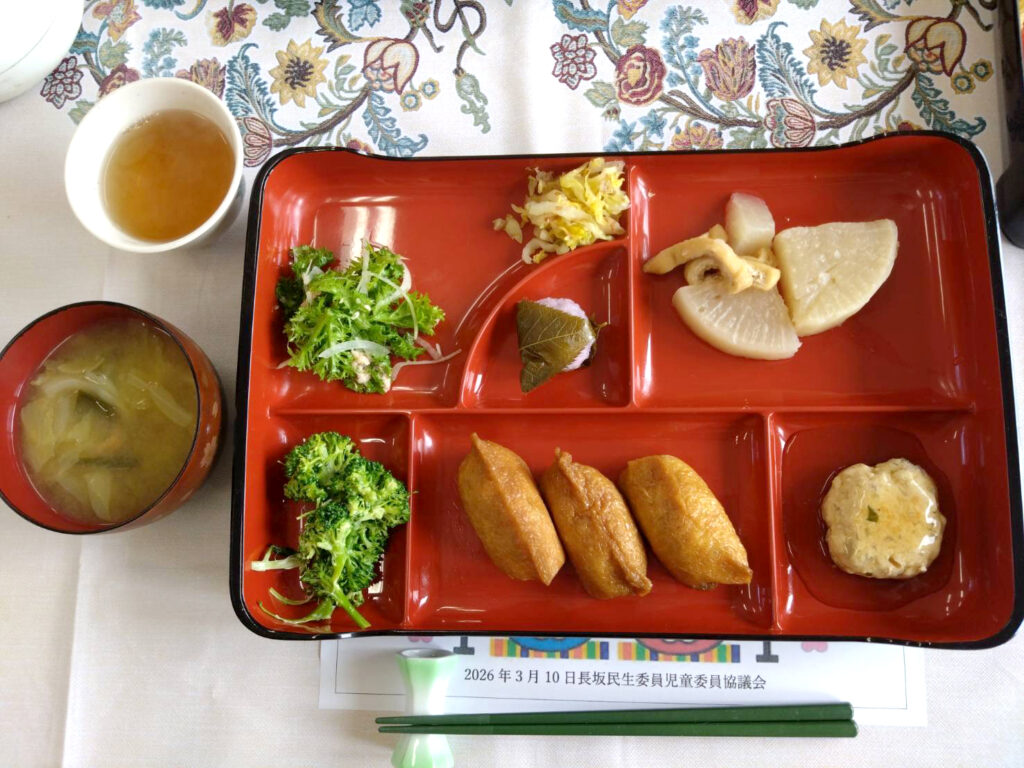 今月のメニューはつくね豆腐のあんかけ、聖護院大根と薄揚げの煮物、わさび菜のサラダ、ブロッコリー、稲荷寿司、白菜の浅漬、みそ汁、桜もちでした。